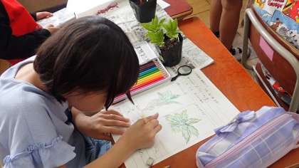 今日は、成長しているホウセンカの様子を観察して、カードに記録しました。葉の形や枚数、茎の様子などを細かく観察していました。