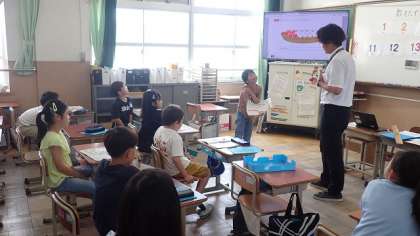 算数では、2つの数の大小を比較するとき、どこに目を付けて比べるとよいかについて話し合いました。グループで話し合い、考えをホワイトボードにまとめていました。外国語活動では、持っているりんごの数を“How many?”“six apples.”などと尋ねたり答えたりしました。