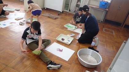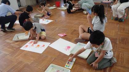手のひらや足の裏に絵の具をぬって、それを画用紙にスタンプする活動に取り組みました。好きな色の絵の具をつくり、手や足にぬるのはなんだかわくわくします。思い思いにスタンプすることができました。