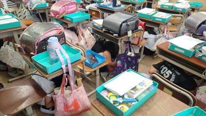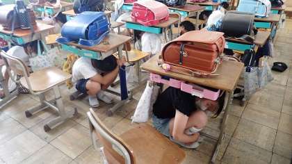 スピーカーから、大きな地鳴りの音が聞こえてきました。続いて、地震発生を知らせる緊急放送が入ります。子どもたちは、地鳴りの音が聞こえると、素早く机の下に入って身を守りました。写真には一見何も写っていないように見えますが、子どもたちの避難がとても上手な証拠です!