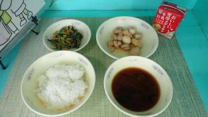 「鶏肉のさっぱり煮」は、砂糖、みりん、料理酒、濃口しょうゆ、米酢などで鶏肉を甘酸っぱく味付けしています。名前の通り、食べると口の中がさっぱりし、鶏肉のおいしさを味わっていただくことができました。「赤だし」は、信州みそと八丁みそでつくっています。普段のみそ汁とは違う味を味わっていただきました。