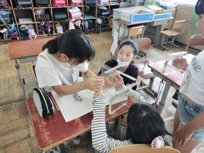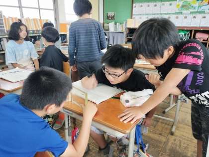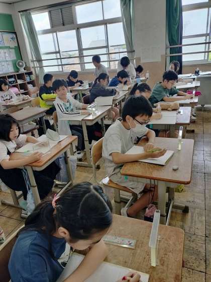 1人1匹のメダカを配ってもらい、その様子を観察しました。目の前でメダカをじっくり観察して、詳しくかいていきます。気付いたことを交流していくと、ヒレの様子がなんだか違うことに気付きました。それは、メダカのオス・メスの違いによるものです。目の前のメダカの観察から発見につながる学びを経験することができました。