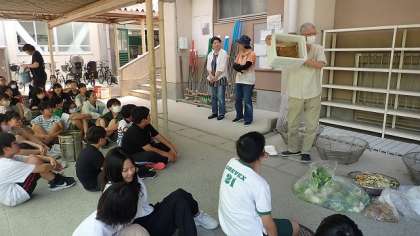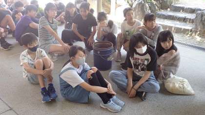 説明を聞かせていただいた後、みんなでたい肥づくりを始めました。