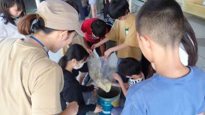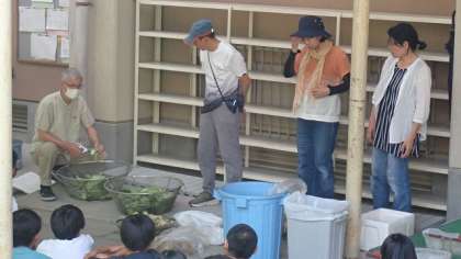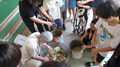 まずは、竹パウダーを缶に入れます。その後、生ごみを投入しました。生ごみは、給食調理で出た生ごみを使いました。生ごみからは、思わず鼻をつまみたくなるようなにおいがします。