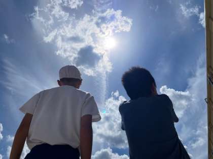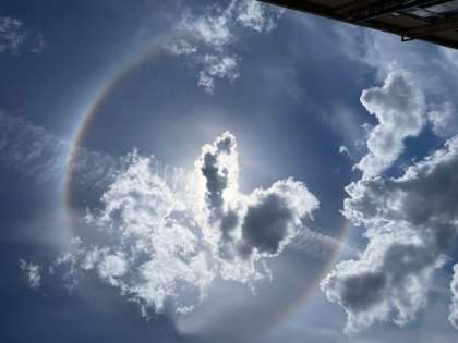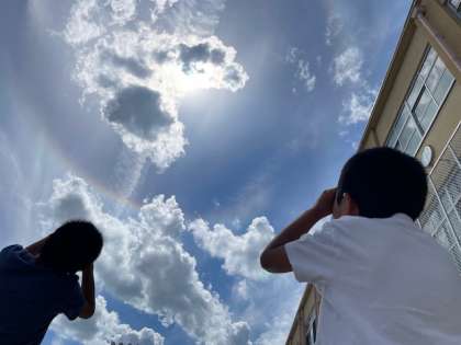14時ごろに校庭に出てみると、太陽を中心として虹が円のようになる「ハロ」が見られました。