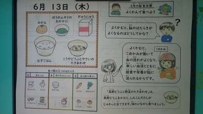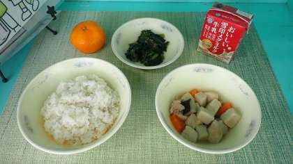 「高野豆腐と野菜のたき合わせ」は、砂糖や薄口しょうゆ、けずりぶしなどで味付けした高野豆腐を、鶏肉、にんじん、干ししいたけとたき合わせています。高野豆腐によく味がしみこみ、やわらかい鶏肉やにんじんと一緒においしくいただきました。「みかん」はとても冷たく、暑い今日にはぴったりでした。