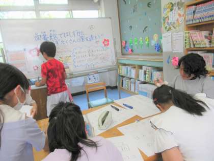 来週から「あじさい読書週間」が始まります。それに先駆けて、本日は教職員の読み聞かせがありました。図書委員会の子どもたちも、来週に向けて準備を進めています。おすすめ本のポップを作ったり、クイズラリーのクイズを考えたり休み時間も頑張って取り組んできました。