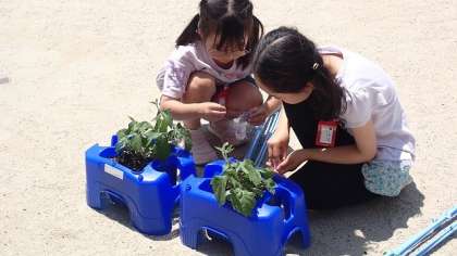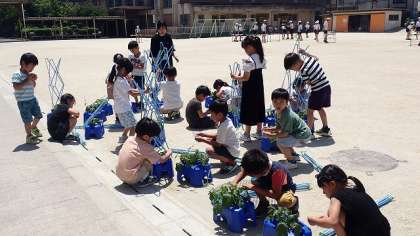 今日は、大きくなってきたアサガオの鉢に追肥をしてやり、支柱を立てました。毎日欠かさず水やりをやってきたアサガオは、ぐんぐん大きくなっています。これから、つるが伸びていくのが楽しみです。