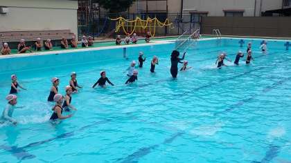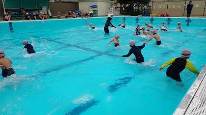 今日はまだ低水位なので、プールの水の中を歩いたり、ワニさん歩きをしたりしました。最後には、碁石拾いをしました。