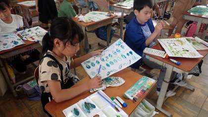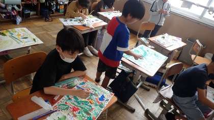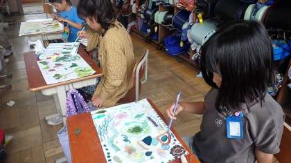 いろいろな形や大きさの落ち葉の中から、お気に入りの葉を見つけてきました。その葉の形や色を生かした作品づくりに取り組みました。絵の具で「自然の色」をつくり、葉に塗ってスタンプしたり、作った色でもようをかきくわえたりしました。