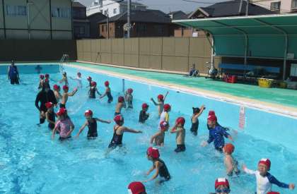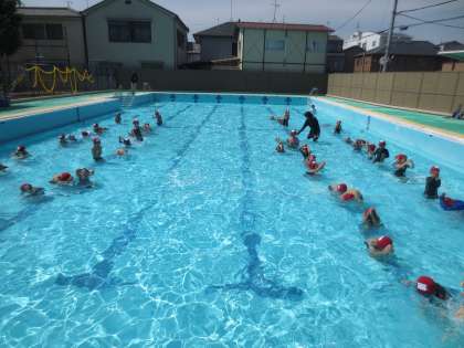 50cmほどの水位だったので、今日は歩いたり走ったり、また、ロケットに変身して水の中に潜ってから「発射!」で飛び出したり、いろいろな方法で水慣れをしました。