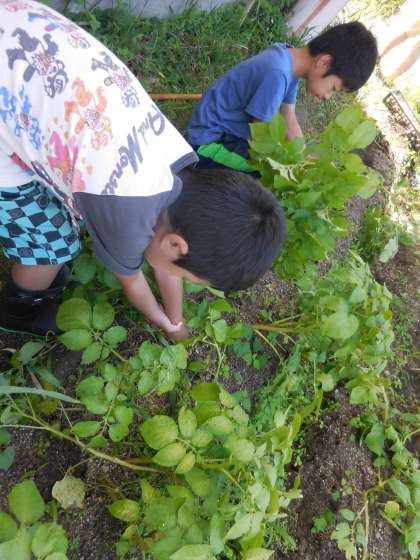 むくのき学級では、先週、春に苗を植えたじゃがいもを掘りをしました。はじめは、素手で土を触ることに抵抗があった児童も、たくさんじゃがいもが穫れることに楽しくなってきて、どんどんと素手で掘り進めていました。思っていた以上にたくさんのじゃがいもを収穫することができました。