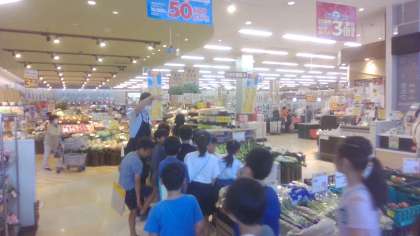 まずは店内を歩き、商品や売場ついてお話していただきました。「なぜ野菜コーナーが入口近くにあると思う?」という問いに、子どもたちは一生懸命考えて答えていました。商品を置く位置にも工夫があることを知ることができました。