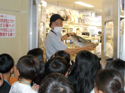 お店の裏側も見せていただきました。「バックヤード」は初めて入る場所で、子どもたちは興味津々な様子でした。お店に並んでいる果物や野菜、魚などは売り場の裏でカットされていることを知りました。