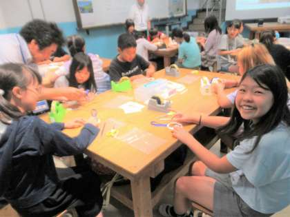工房学習では、セラミックスを使った工作に取り組みました。電池を使わなくても、電気がつく仕組みです。出来上がった後はトントンと叩いて楽しみました。