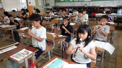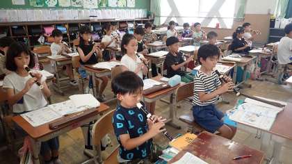 3年生になってから使い始めたソプラノリコーダーですが、少しずつ演奏できる音も増やしています。たくさんの穴をふさぐとより低い音が出せるようになりますが、その分、指づかいがむずかしくなり、正しい音も出しにくくなってきます。まだまだ小さな3年生の手ではむずかしいこともありますが、くり返し練習して美しい音色で演奏できるようになっていってほしいと思います。