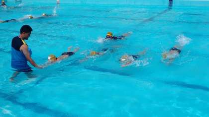 今日は、梅雨の晴れ間ものぞくお天気でした。4年生の子どもたちは、クロールや平泳ぎから自分の課題となる泳ぎ方を選んで、練習に取り組んでいます。バディの友達同士で見合ったり声を掛け合ったりして、正しい泳ぎ方を身につけようとがんばっていました。