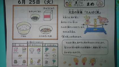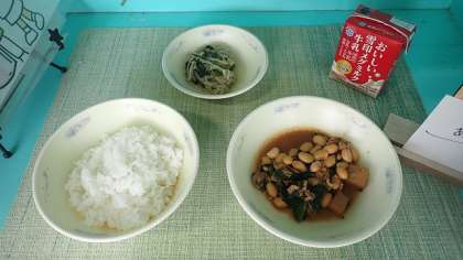 「肉みそいため」は、赤みそ、八丁みそが使われていてコクがあり、みその味が食欲をかきたててくれます。豚肉の他にも、大豆、ほうれん草、こんにゃく、しいたけなどたくさんの具材にもよく味が染みており、ごはんによく合う献立でした。