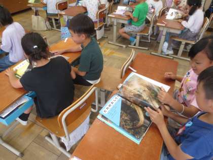 自分達でクイズを作るために、ほんのもりにある本を見て、クイズにしたいものを見つけました。