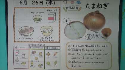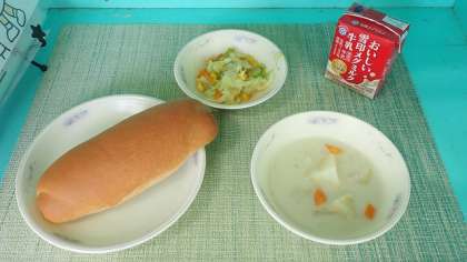 「じゃがいものクリームシチュー」は、子どもたちの大好きな献立です。給食のクリームシチューは、「ルー」から給食調理員さんの手作りです。コクがたっぷりのルーを味わいながら、じゃがいもや鶏肉などがたくさん入ったクリームシチューをおいしくいただきました。「野菜のソテー」は、キャベツの甘みがよく出ていました。さらにコーンの甘みも加わって、とてもおいしくいただきました。