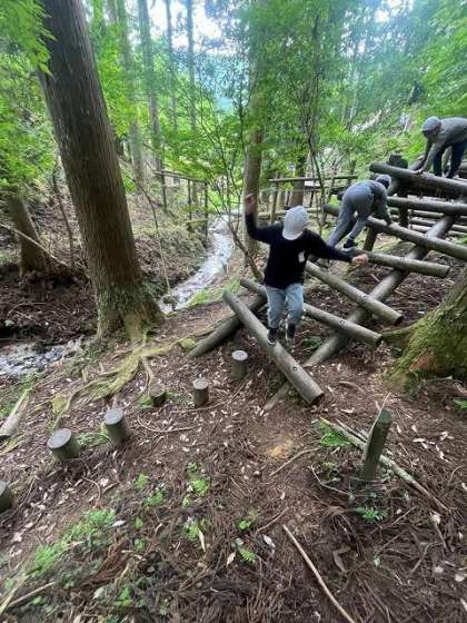 「冒険の森」にはいろいろなアスレチックがあります。自分にできそうなところを選んでチャレンジしています。