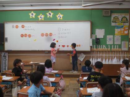 音楽の時間に、「たん・たん・たん・うん」のリズムの言葉と「たた・たた・たん・うん」のリズムの言葉から2つずつ選んで、ペアでリズムを打つ発表会をしました。