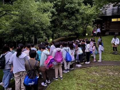 いよいよ、夜の活動「キャンプファイヤー」が始まります。エンターテイナーマスターたちが準備してくれた営火場に向けて移動しています。