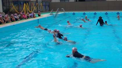 腕を耳の後ろで組み、プールの壁を蹴って「ふし浮き」で前に進む練習をしました。体の力を抜くと、上手に水に浮くことができます。前に進まなくなったら、もう一度プールの底を蹴ってふし浮きをします。何度も挑戦して、コツをつかもうとがんばっていました。