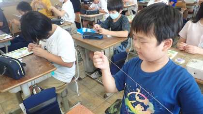 5年生から始まった家庭科の学習では、これまでに経験しなかった学習がたくさんあります。この単元では、「裁縫セット」を使った学習に取り組みます。今日は、「玉結び」にチャレンジしました。はじめての経験で、なかなかできないものですが、みんな根気強く練習していました。