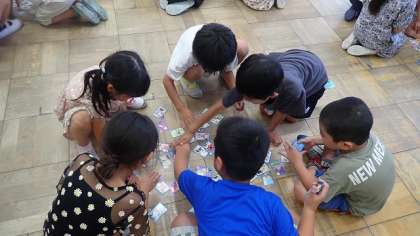 これまでにすべてのひらがなを学習しました。今日は、読みと字が結びついているかを確かめるために、みんなでかるたをしました。残りの札が少なくなってくると、先生の読み始めの音に素早く反応して、ねらっていた札を取ろうとがんばっていました。