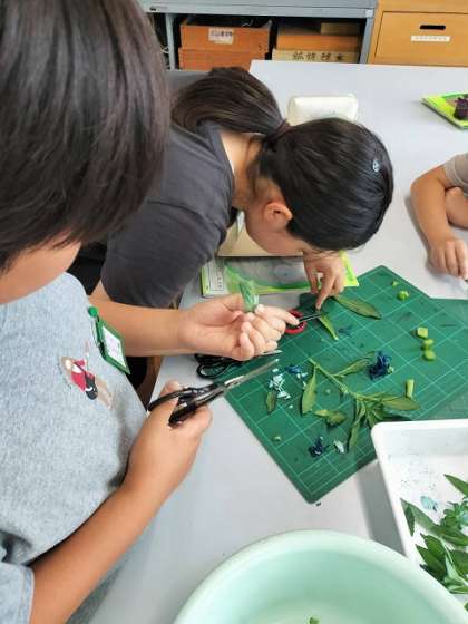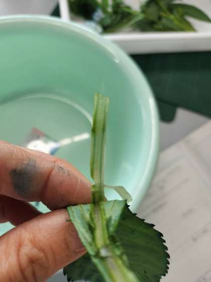 植物が根から取り入れた水は、植物の体のどこを通って全体にいきわたるのかについて、実験を行って確かめました。植物染色液を根から吸い上げさせたあと、根、茎、葉、葉の付け根を切って、様子を観察しました。青く染まっているところがわかると、子どもたちはとても興味深そうに観察していました。