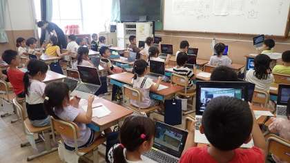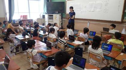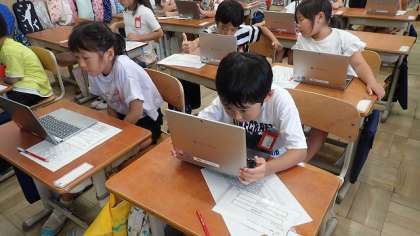 子どもたちは、はじめてタブレット端末を使いました。起動の仕方を確かめ、一人一人のログインIDとパスワードを入力して、端末を起動させました。その後、カメラ機能を使って写真を撮影しました。はじめてつかうタブレット端末に、子どもたちは興味津々でした。