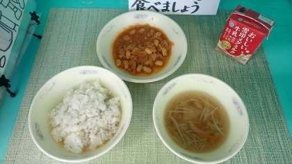 今日は、子どもたちに人気の「大豆とツナのドライカレー」です。大豆、ツナ、たまねぎ、にんじんなどの具が入っているドライカレーで、カレーとガーリックの香りが食欲をそそります。ごはんに混ぜて、お腹いっぱいいただきました。「スープ」は、たまねぎ、もやし、にんじんが入っています。野菜の食感を楽しんでおいしくいただきました。