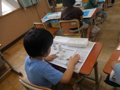 図画工作の学習で、粘土をしました。作りたいものを決めてから取り組んだり、色々触りながらできたものを見立てたりして、楽しみました。