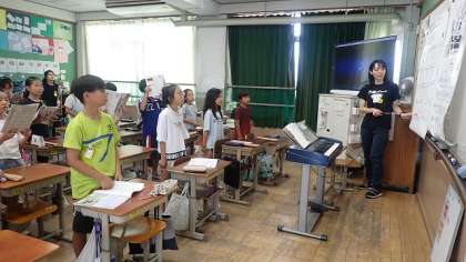 歌声の出し方を意識して、「まきばの朝」を歌っています。頭声的な発声で響きのある歌声は難しいですが、おなかの支えを意識してよい声が出るようにがんばっています。よい姿勢の友達を参考にしています。