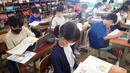 5年生は、道徳の「古いバケツ」のお話を読み、明るい気持ちになってそうじを続ける「わたし」の気持ちを考えることを通して、男女仲よく協力し、助け合っていこうとすることの大切さについて考えました。