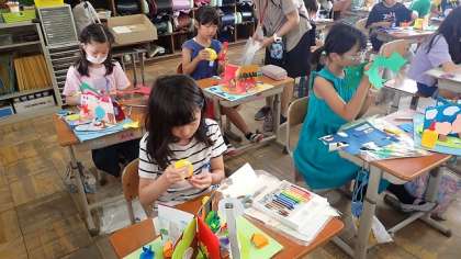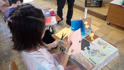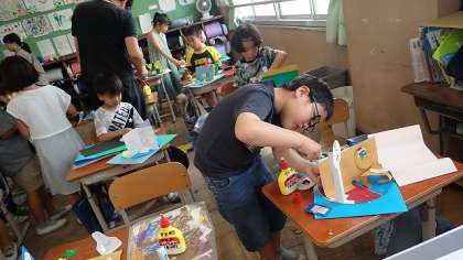 わりピンを使った回転する仕組みを生かした作品づくりも、いよいよ完成に近づきました。最後のひと手間をかけて、自分の作品をよりよいものにするようにがんばっています。持って帰りましたら、がんばったところの話をぜひ聞いてください。