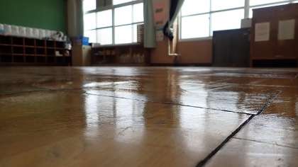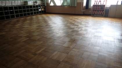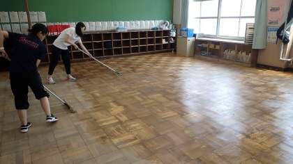 教室環境の整備の一つとして、教室のワックスがけをしています。今日は、1年生の担任の先生が、学年の教室で作業をしていました。ワックスをかけると、教室の床がつやを取り戻し、床の木材がワックスを吸うと、落ち着いた色になり滑りにくくなります。