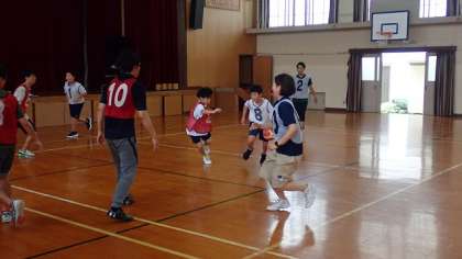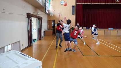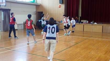 夏休み3日目です。今日は、部活動バスケットボールの子どもたちが練習をしました。今日は人数が少なかったので、先生を相手に試合をしました。ドリブルで相手のマークを振り切ったり、積極的にシュートを打ったりして汗を流しました。