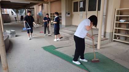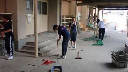 体育館や校舎入口にあるマットを固定しています。マット本体やマットの下には、たくさんの砂がたまっていました。(みんながしっかりマットで土を落としてくれている証拠ですね。)たまっていた砂をきれいに掃き取り、テープでマットを固定しなおしました。