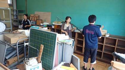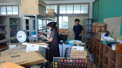 北校舎3階の資料室には、算数や国語の教具や社会の昔の道具など、子どもたちの学習に使うものが保管されています。たくさんのものがあるので、何があるのか、不要なものはないかを点検し、整理や処分をしました。