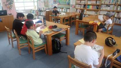 9時になると、数名の子どもたちが「ほんのもり」にやってきました。読みたかった物語を読む子、スポーツについての本を読む子(パリオリンピックの影響でしょうか)、友達を待つ間、夏休みの課題をする子など様々です。「もう120冊読んだよ」と教えてくれた1年生もいました。