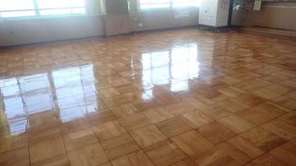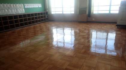 教室の床の研磨・コーティング作業の4日目です。表面に3度目になる最終コーティングをしてくださいました。さらにつやがあり、鏡のように光を反射しています。