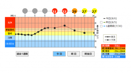 本日も京都府に熱中症警戒アラートが出されています。10時40分の運動場における暑さ指数(WBGT)がすでに【危険領域】となっているため、本日の運動場開放を中止します。今日は運動場で遊ぶことができませんので、子どもたちにお伝えください。