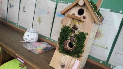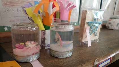 教室に行くと、後方のロッカーの上に夏休みの自由研究でつくってきた作品が並んでいます。