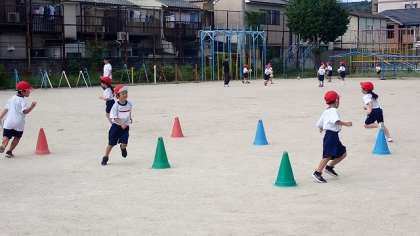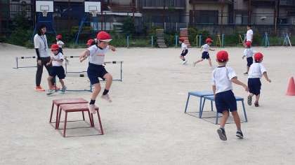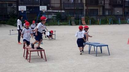1年生は、体育の「まねっこあそび」の学習をしています。ハードルやポートボール台、ミニコーンで作ったコースを、アスレチックのようにしてクリアしていきます。前の友達がどのようにして乗り越えたかを見て、後ろのみんなはまねっこしながら楽しそうにクリアしていきました。