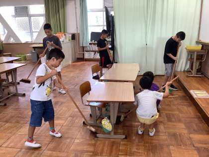 全員でほうきを持って、教室を掃除しました。「先生見てみて!」と上手に掃く姿を見てほしい低学年の友達。見本となるように教室の隅まで掃く高学年の友達。どちらの姿も1学期からの成長を感じる時間でした。