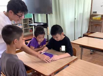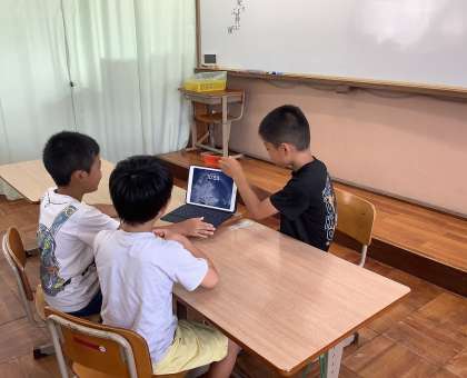 そして冬に向けて、育てたい野菜をみんなで考えました。2つのグループに分かれて、タブレットを使いながら、植える時期を調べ、候補を出し合いました。