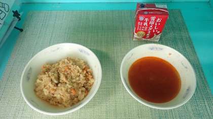 「カレーピラフ」は、台風に備えた献立で、まぐろフレークやたまねぎ、にんじんとアルファ化米を使って、給食室の大きな釜で炊きました。炊きたてのほかほかしたごはんをおいしくいただきました。