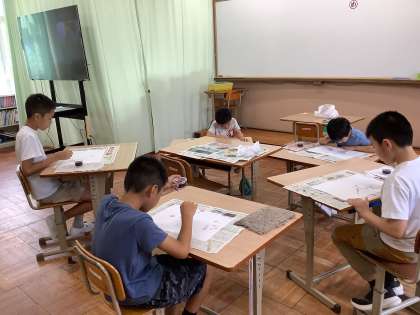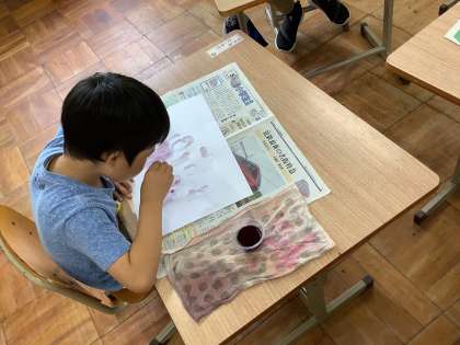 出来上がった色水で絵を描いてみたり、模様を付けたりしました。一人ひとり色の濃淡が違い、「○○さんは濃いね。」「◇◇さんの模様はとても良い感じ!」など子どもたち同士の繋がりも見られました。